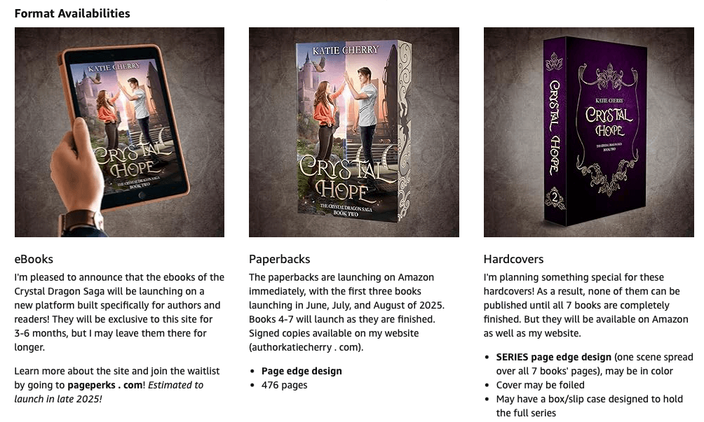 3—Yes, only the paperback is available right now. The ebook will be exclusive with pageperks.com, a new site/app that will be launching soon (currently projected to be later this year). It will be HUGE for authors and readers alike, so I happily volunteered to support the launch with this series. I’ll be sharing more about PagePerks soon, but for now just know that though yes this is strange, it is a GOOD thing and I hope you’ll agree that it’s worth the wait!