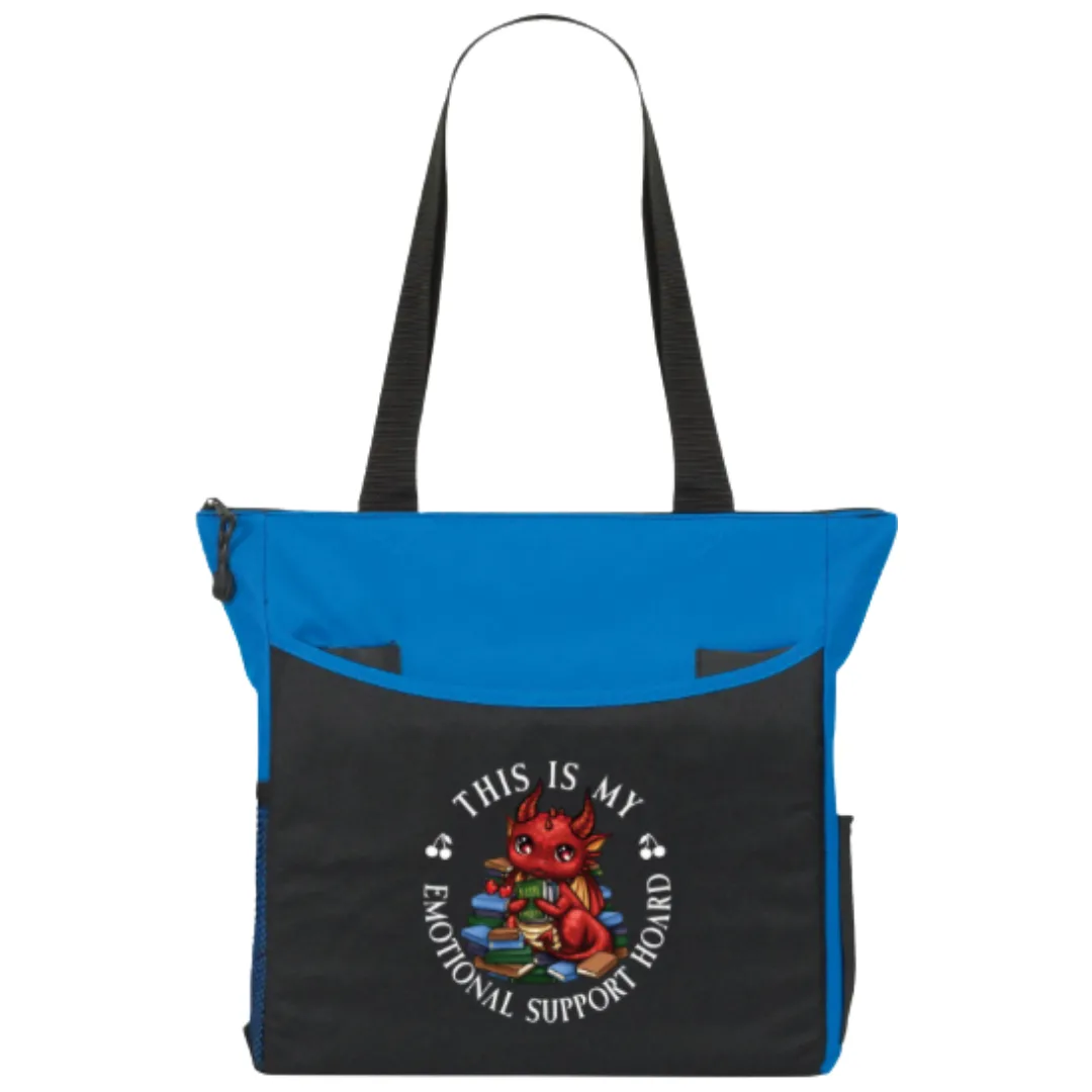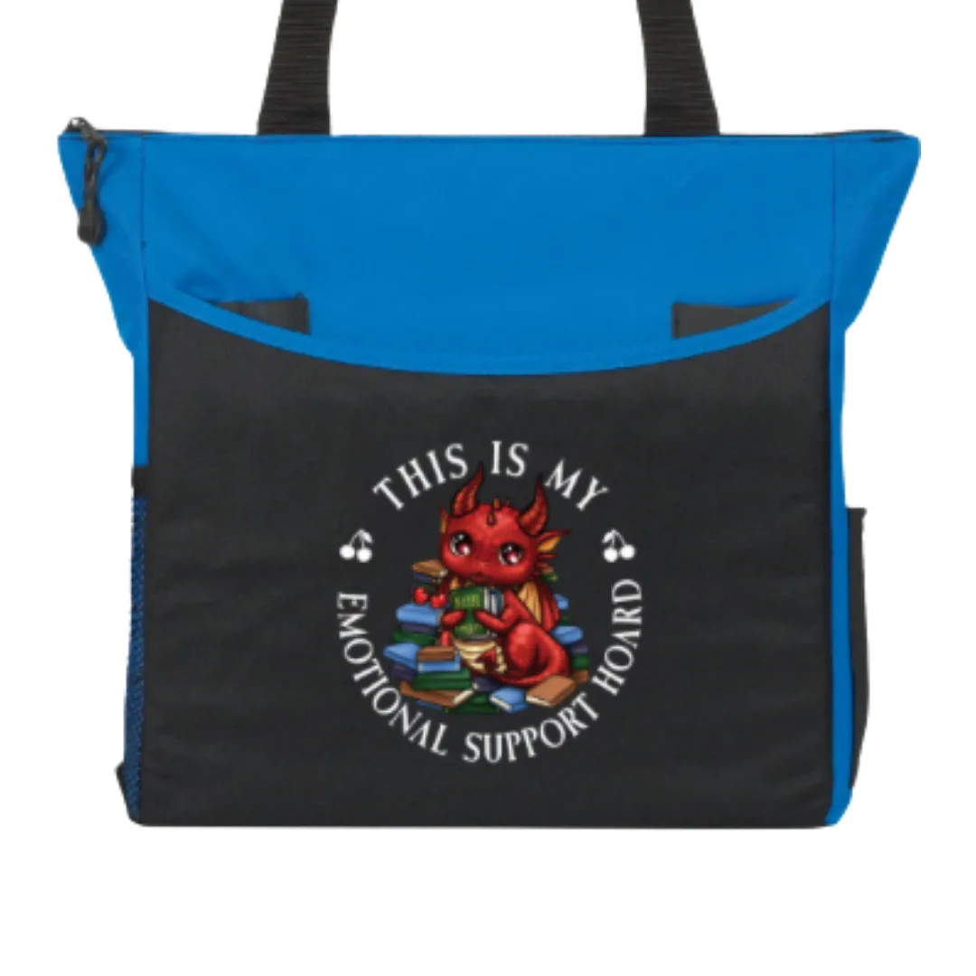 I may have found the best option for a custom tote bag! Not only does this sport the gorgeous new chibi art of Spitfire with the caption “This is my emotional support hoard”, but it’s big and strong enough to actually be useful—AND there’s lots of pockets!!